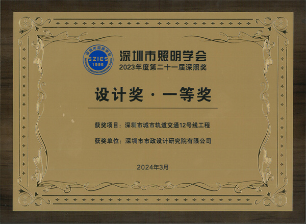 近日,深圳市照明學會舉辦了2023年度第二十一屆“深照獎”頒獎典禮。公司軌道交通院承擔勘察設計總承包的“深圳市城市軌道交通12號線工程”榮獲“深照獎”設計獎一等獎。