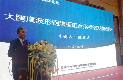 陳宜言董事長在大會上做了題為《大跨度波形鋼腹板組合梁橋的發(fā)展創(chuàng)新》的主題演講。他首先介紹了中國橋梁建設(shè)已由橋梁大國向強國發(fā)展中所取得的成就,梳理了中國橋梁發(fā)展的脈絡(luò),還介紹了大跨度波形鋼腹板組合橋這一新型組合橋梁的特點和發(fā)展歷史,并詳細介紹我司對該類橋梁的設(shè)計和創(chuàng)新工作。他還指出,深圳市東寶河新安特大橋的結(jié)構(gòu)創(chuàng)新設(shè)計,證明了我國大跨度波形鋼腹板組合箱梁橋的跨徑已經(jīng)取得巨大突破,當前的設(shè)計和施工技術(shù)水平可以使該橋梁的主跨達到200m。伊朗德黑蘭北部高速BR-06特大橋的成功合龍,體現(xiàn)了大跨度波形鋼腹板組合箱梁橋在強地震烈度地區(qū)的推廣和使用價值。而在建中的合肥市南淝河特大橋,進一步說明了波形鋼腹板組合箱梁橋可以滿足超寬城市橋梁的設(shè)計要求。該橋也是我國首次將耐候鋼大規(guī)模使用到大跨度波形鋼腹板組合箱梁橋上,為我國鋼混組合結(jié)構(gòu)橋梁的防腐和養(yǎng)護提出了新的解決方案。他認為“中國制造2025”概念的提出,為我國由橋梁大國轉(zhuǎn)變成橋梁強國帶來了最佳契機。雖然我國橋梁工程設(shè)計、施工和科研方面都取得了一定成果,但仍需要持續(xù)提升我國橋梁建設(shè)創(chuàng)新能力和技術(shù)競爭力,尤其在結(jié)構(gòu)分析和設(shè)計軟件國產(chǎn)化方面需下大力氣。大跨度波形鋼腹板組合梁橋,比起預(yù)應(yīng)力混凝土梁橋具有顯著的社會和經(jīng)濟效益,將在建設(shè)橋梁強國的過程中發(fā)揮重要作用。近十年來陳宜言董事長對推動我國大跨度波形鋼腹板組合箱梁發(fā)展所做出的貢獻,得到了與會專家學者的贊賞,他對中國橋梁工程發(fā)展創(chuàng)新的觀點也得到大家認同。