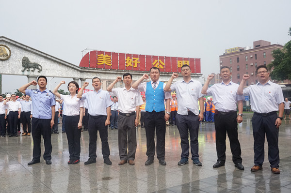 隨后在公明廣場,集團黨委開展了“七·一”表彰暨新黨員入黨宣誓活動。集團黨委隆重表彰了一年來涌現(xiàn)出的黨建工作先進集體和個人,為獲獎代表頒發(fā)榮譽證書并合影留念。在集團黨群工作部李湘楓部長的領(lǐng)誓下,全體黨員冒雨面對鮮紅的黨旗,用洪亮的聲音莊嚴宣誓,表明了自己為黨和國家奮斗終身的堅定決心。