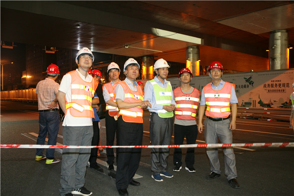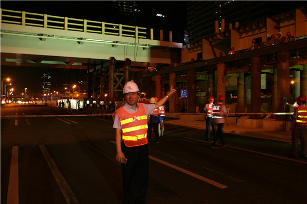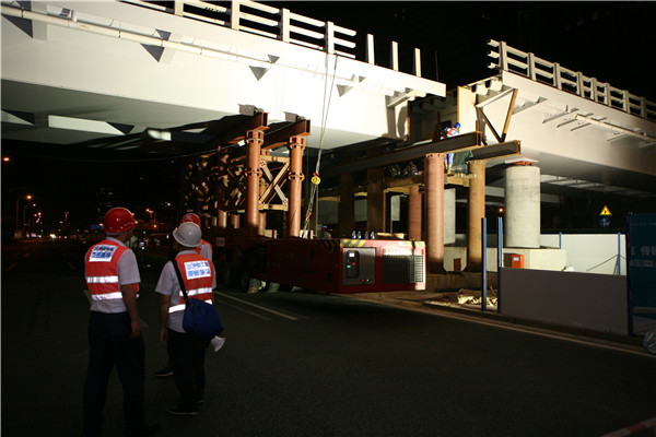 為保證架橋期間深南大道的交通連續(xù),施工采用夜間施工,選擇主線單邊雙向通行的交通疏解方案。采用SPMT模塊車架橋可以將傳統(tǒng)施工工藝7天的工期縮短為14小時左右,大大加快了整個架橋進度,并且把對周邊環(huán)境和交通的影響降到了最低。橋梁架設期間,我公司副總經理歐陽宇峰、橋梁總工王先前、市政四院副院長喬曉冉及項目組成員王延飛、孫志國等作為技術服務組全程提供技術支持。董事長陳宜言大師不辭辛苦,外地開會后晚間23:00趕回深圳,就直赴現(xiàn)場指導橋梁架設。