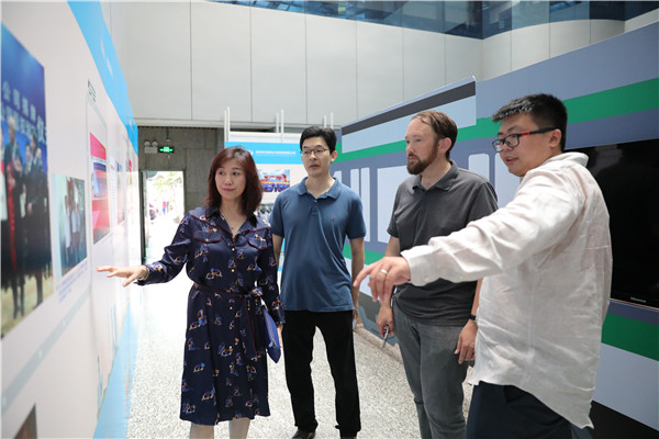 Stuart Buckenham一行在郭明的帶領下先后參觀了公司主樓大堂的“壯闊歲月 再尋初心”主題展、主樓六樓建筑規(guī)劃設計院,隨后前往主樓七樓學術活動室進行座談交流。