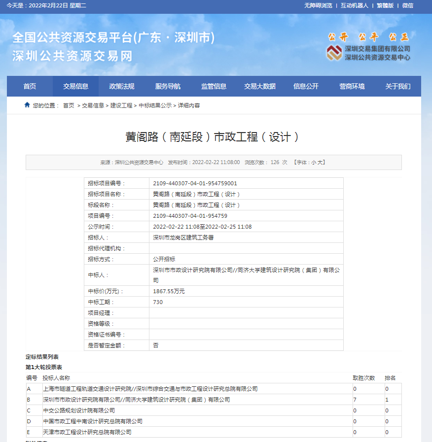 2022年2月22日,經(jīng)深圳市公共資源交易中心中標(biāo)公示通過,深圳市政院與同濟(jì)大學(xué)建筑設(shè)計研究院(集團(tuán))有限公司(聯(lián)合體)在深圳市龍崗區(qū)建筑工務(wù)署黃閣路(南延段)市政工程(設(shè)計)項目公開招標(biāo)中成...