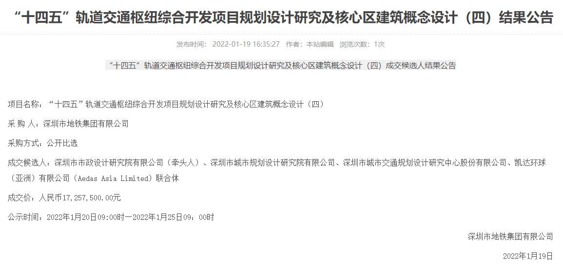 日前,經(jīng)深圳市地鐵集團(tuán)有限公司官網(wǎng)中標(biāo)公示通過,深圳市政院軌道交通院作為聯(lián)合體牽頭方參投的“‘十四五’軌道交通樞紐綜合開發(fā)項目規(guī)劃設(shè)計研究及核心區(qū)建筑概念設(shè)計(四)”喜獲中標(biāo),中標(biāo)金額...